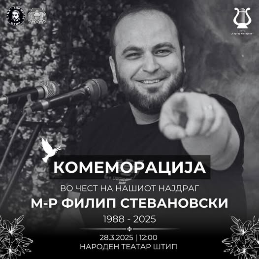 “Во петок (28.03.2025 год) со почеток од 12:00 часот во Народен театар – Штип во заедничка организација на НУЦК “Ацо Шопов” Штип и ДМУЦ ,,Сергеј Михајлов” – Штип ќе се одржи комеморација во чест на прерано починатиот, наш и непреболен м-р Филип Стевановски.” – известуваат од НУЦК “Ацо Шопов” – Штип