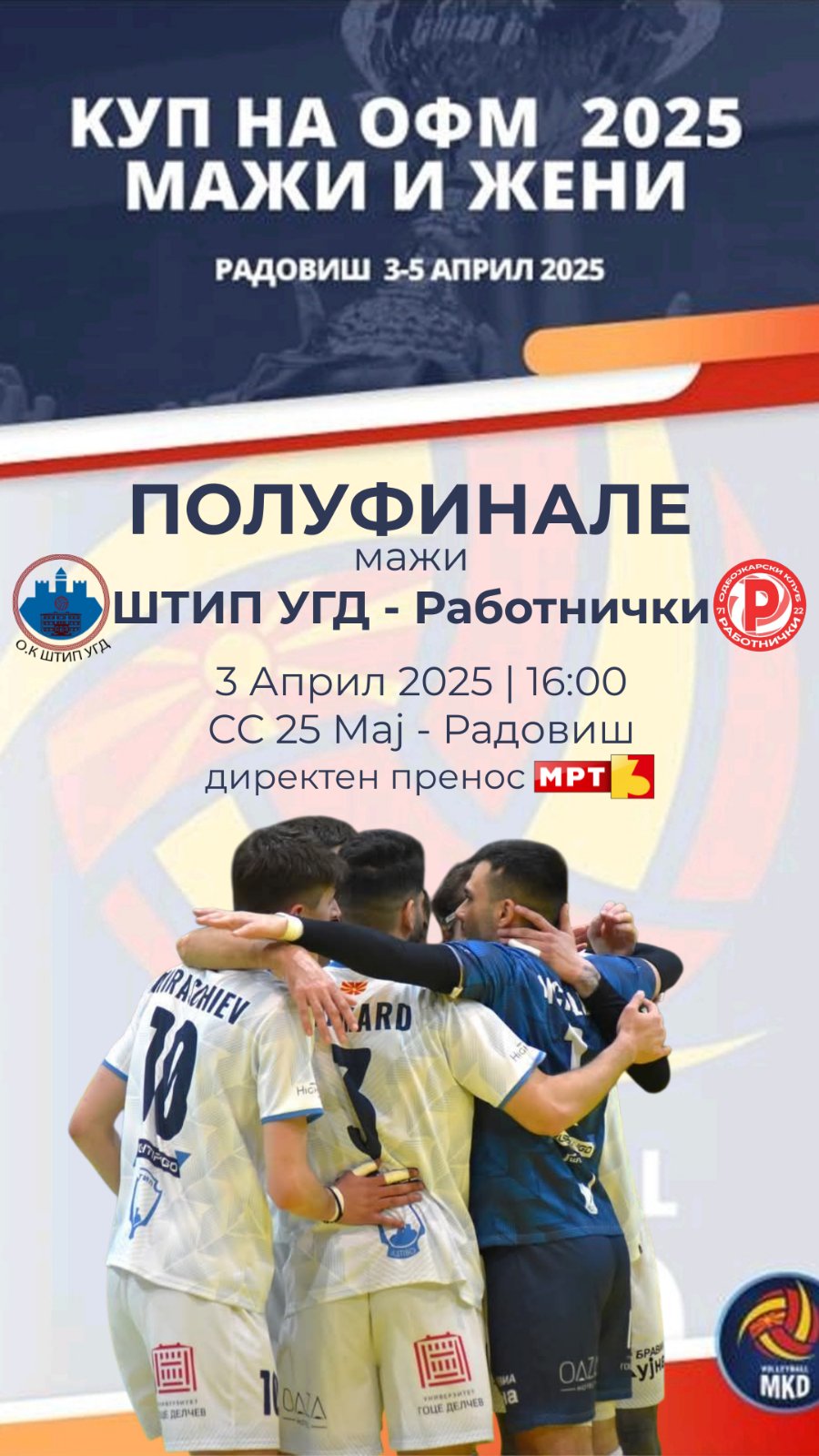 Полуфиналето против ОК Работнички е закажано за денес во 16:00 во Радовиш. Евентуалното финале е во сабота во 19:00 часот.