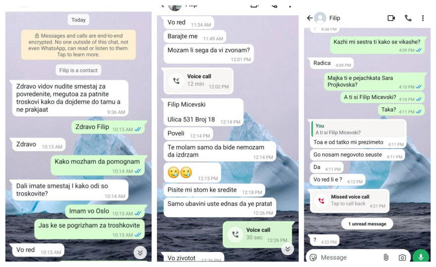 „Тој ми раскажа дека неговата сестра, која била со Сара во клубот, сега лежи во болница во Скопје со тешки изгореници и дека во петок треба да ја префрлат во болница во Осло. Звучеше вознемирено, дури и плачеше – толку убедливо што почнав да го тешам. Потоа ми побара пари за маст за изгореници, и тогаш почнав да се сомневам. Ми испрати и слика од пасош, но веднаш забележав по годината на раѓање дека личноста на него е 30-годишен маж, а не 20-годишно момче“, пишува Дабевски