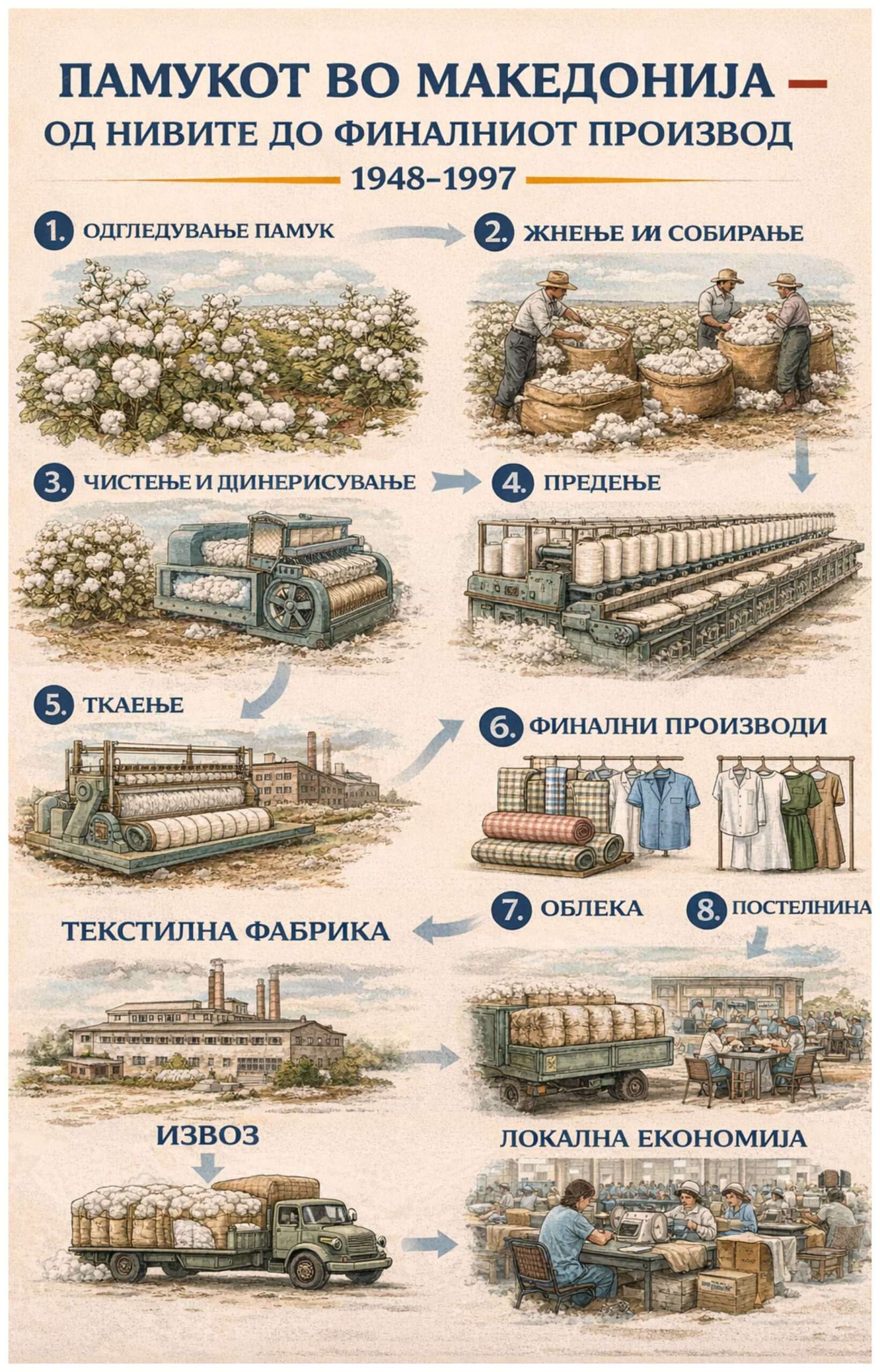 Собраниот памук се обработувал во локалните текстилни фабрики, каде се создавале предиво од памук- за плетење, ткаење и трикотажа, памучни ткаенини- за кошули, блузи, здолништа, панталони, постелнина и домашен текстил