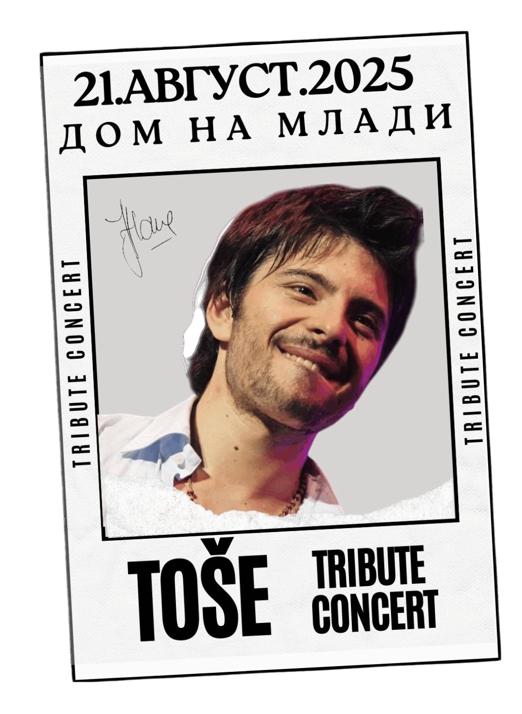 – Од 21:00 започнува главниот сегмент од ноќта посветена на нашиот Тоше. Со unplugged изведба, концертот го отвораат Duo Bright & Lili Аcoustic. По нив, на сцената настапуваат The Hounds со свој аранжман на неколку песни од Тоше. Потоа настапуваат: Мартинијан Кириловски, Андријана Петрушовска, Антониа Гиговска, Бени, Дани, Мики Секуловски, Наташа Малинкова, Атанас Петров, Марија Данева, Виолета Арсовска & Виктор Манев, Зоран Илиев, Огнен Здравковски…