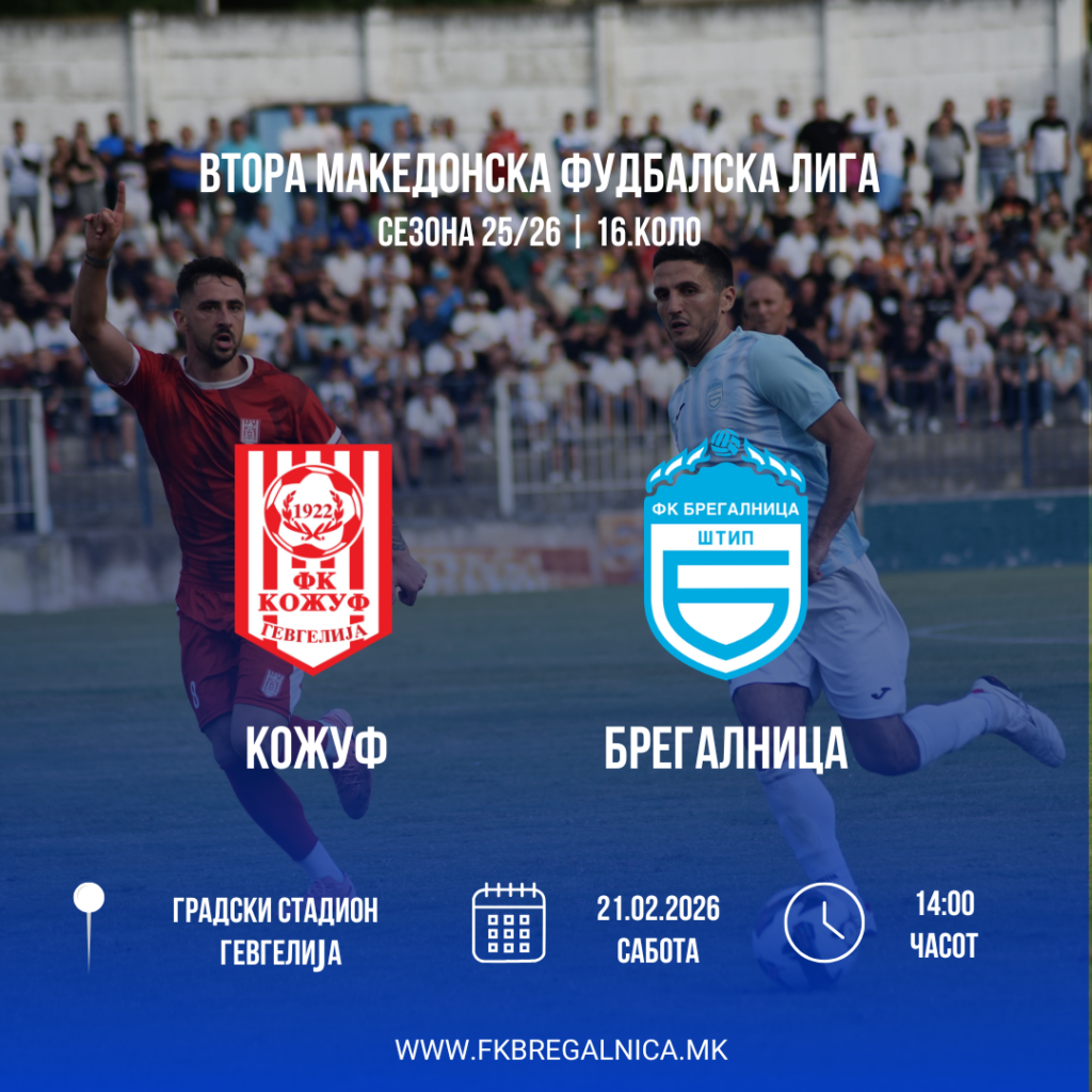 Штипската гордост, екипата на ФК Брегалница во сабота (21.02.2026) го отвора вториот дел од фудбалската 2025/2026 сезона. Штипските сини во првото коло од пролетната полусезона гостуваат на екипата на Кожуф во Гевгелија.